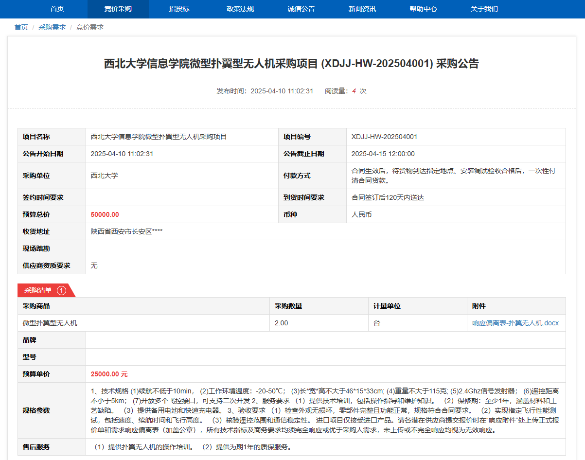 西北大学信息学院微型扑翼型无人机采购项目(XDJJ-HW-202504001)竞价采购公告