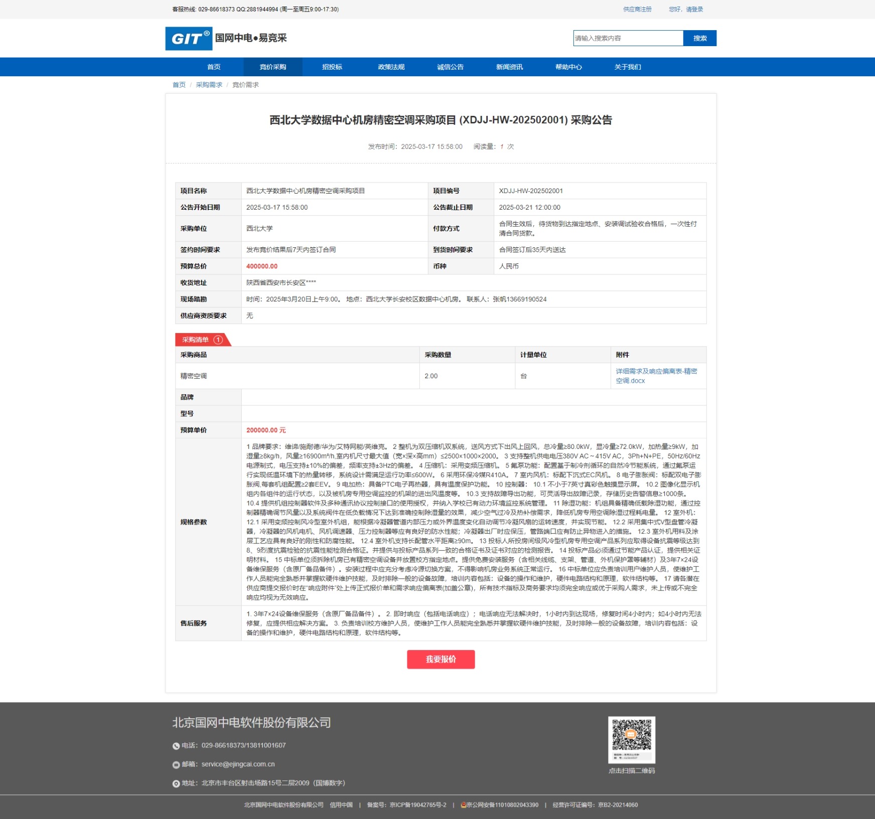 西北大学数据中心机房精密空调采购项目 (XDJJ-HW-202502001)网上竞价采购公告