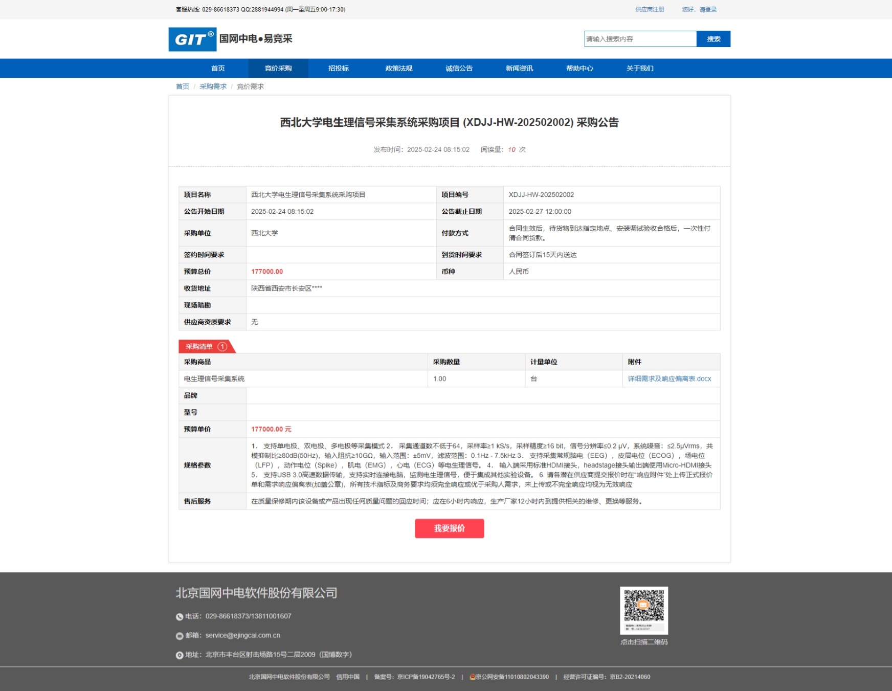 西北大学电生理信号采集系统采购项目 (XDJJ-HW-202502002) 竞价采购公告