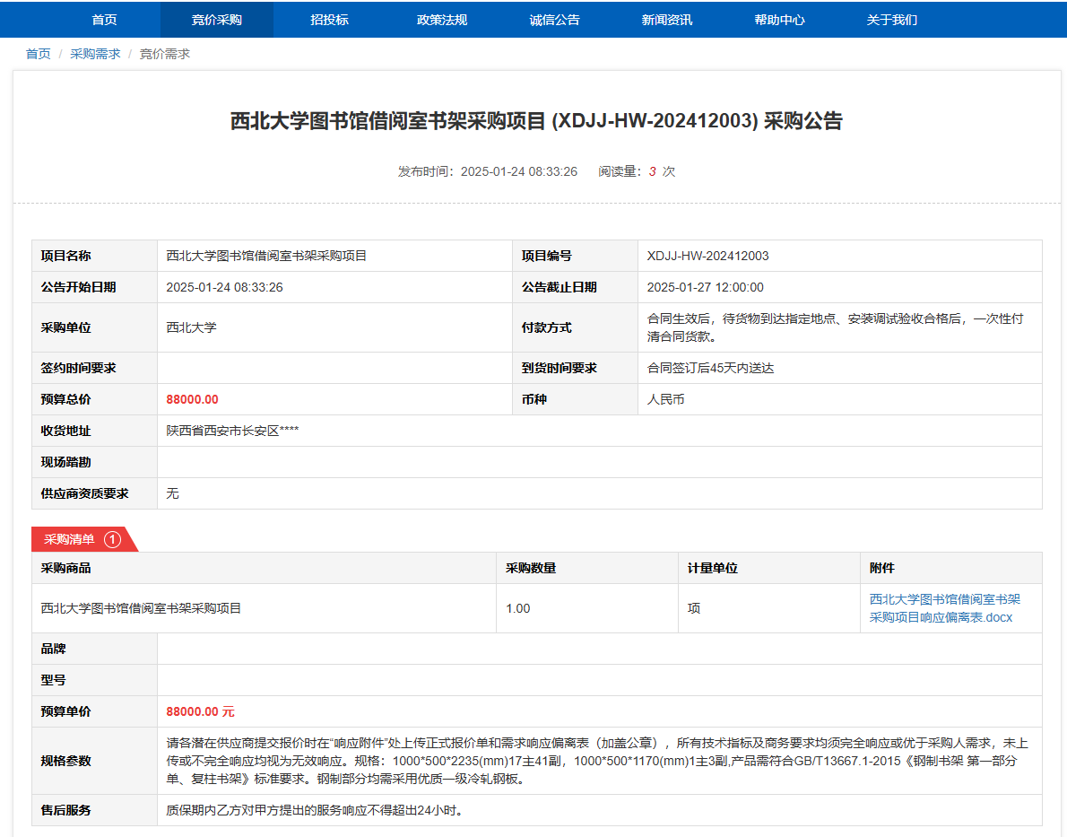 西北大学图书馆借阅室书架采购项目 (XDJJ-HW-202412003) 采购公告
