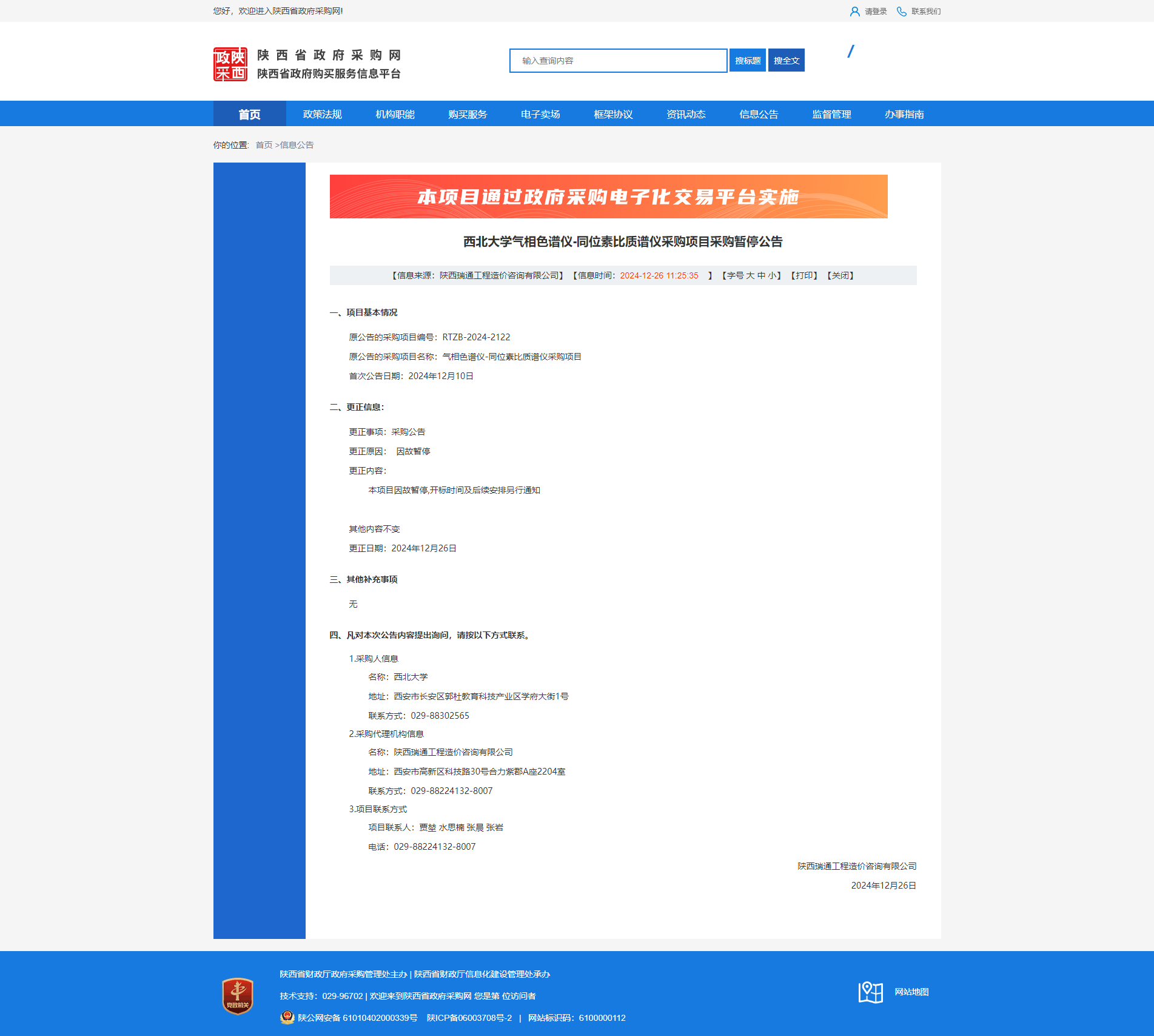 西北大学气相色谱仪-同位素比质谱仪采购项目采购暂停公告