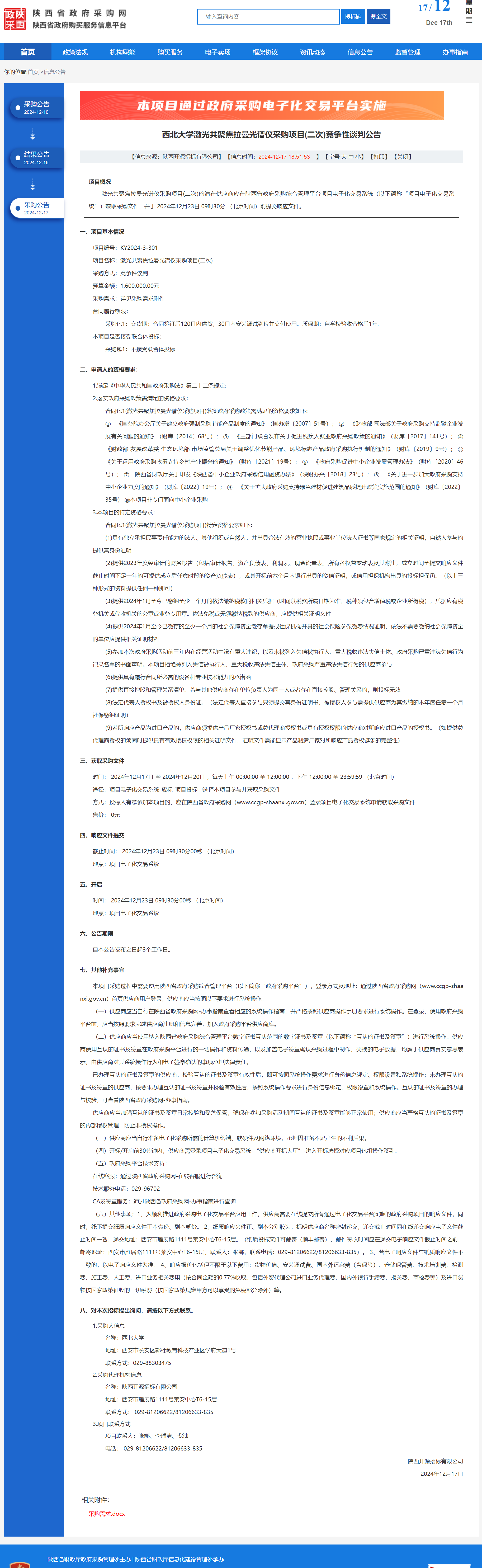 原公告链接:https://www.ccgp-shaanxi.gov.cn/freecms/site/shaanxi/ggxx/info/2024/8a69c44e9218572b0193d434f6c730a9.html?noticeType=001013¬iceId=8ed4237e-bc66-11ef-8063-08c0eb20c666