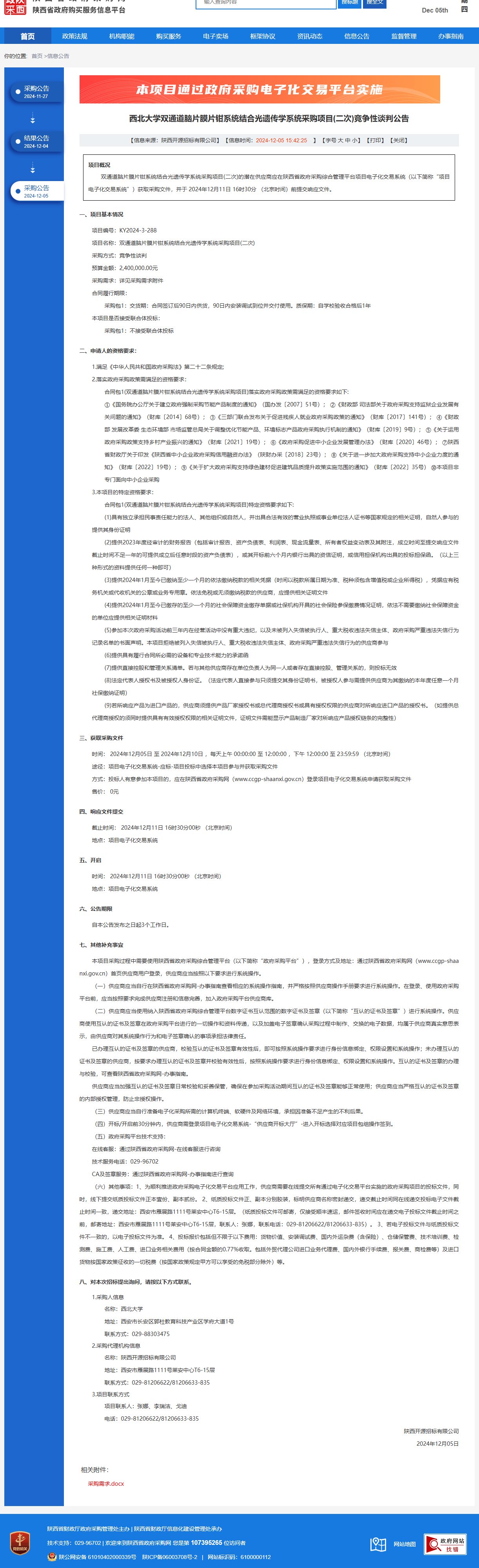 原公告链接:https://www.ccgp-shaanxi.gov.cn/freecms/site/shaanxi/ggxx/info/2024/8a69c44e9218572b0193959c7d8f36e5.html?noticeType=001013¬iceId=13c69da8-b2de-11ef-8063-08c0eb20c666