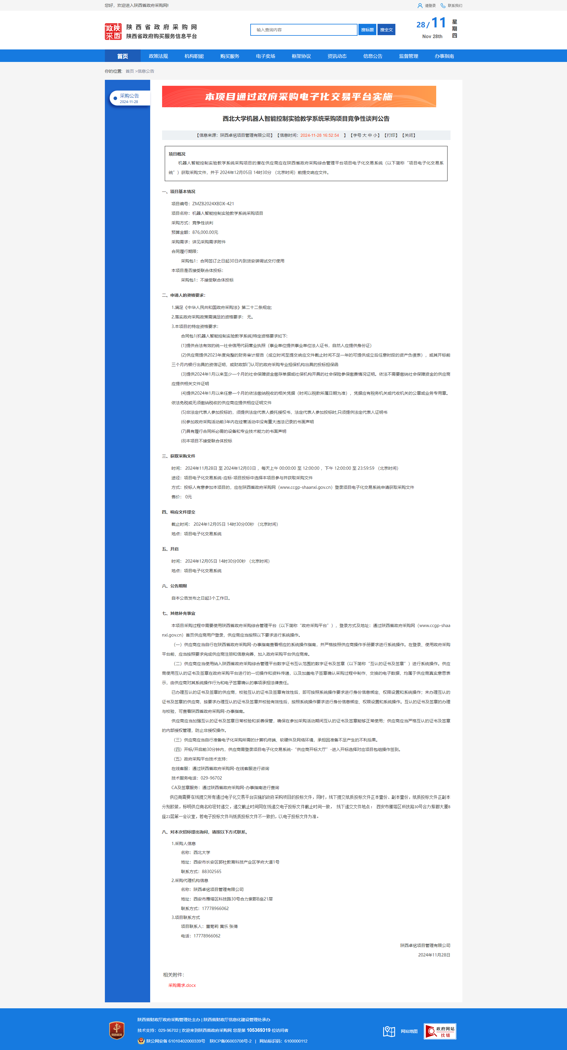 西北大学机器人智能控制实验教学系统采购项目竞争性谈判公告