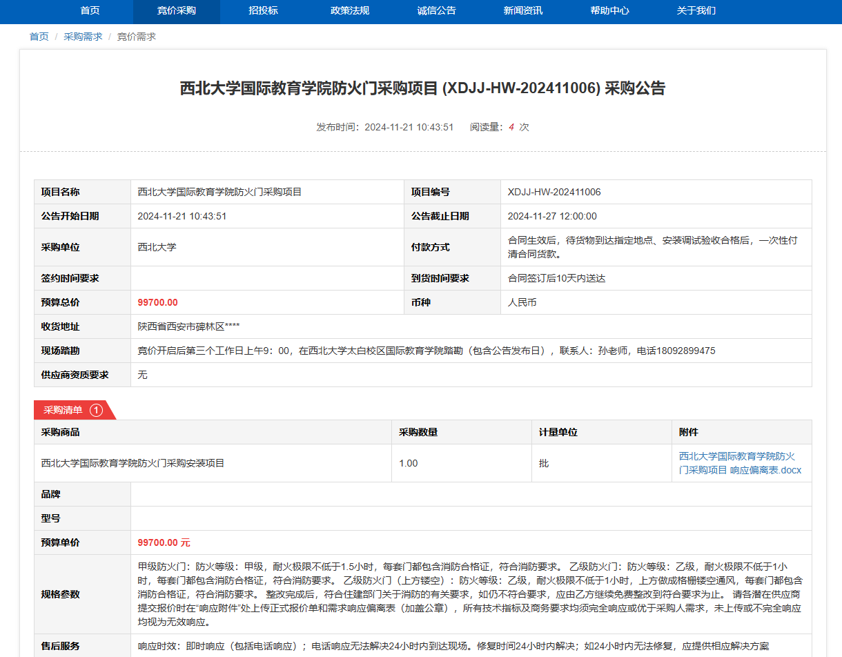 西北大学国际教育学院防火门采购项目(XDJJ-HW-202411006)竞价采购公告
