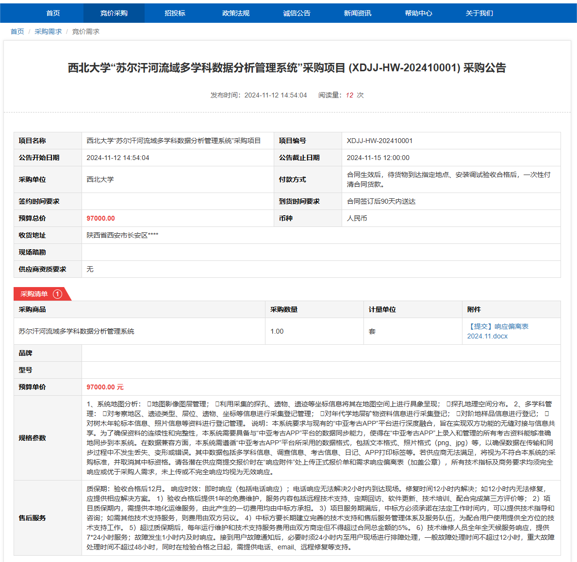 西北大学“苏尔汗河流域多学科数据分析管理系统”采购项目(XDJJ-HW-202410001)竞价采购公告