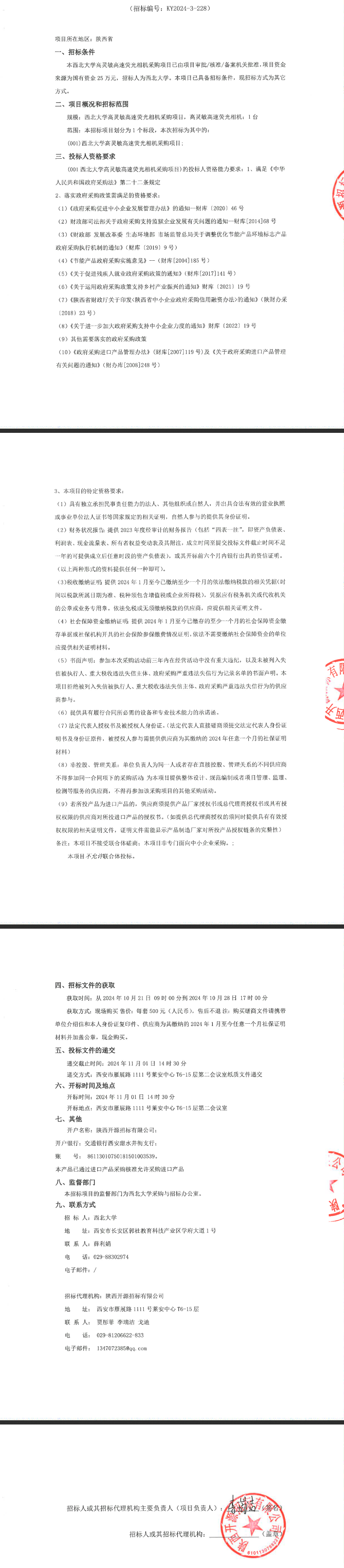 西北大学高灵敏高速荧光相机采购项目竞争性磋商公告