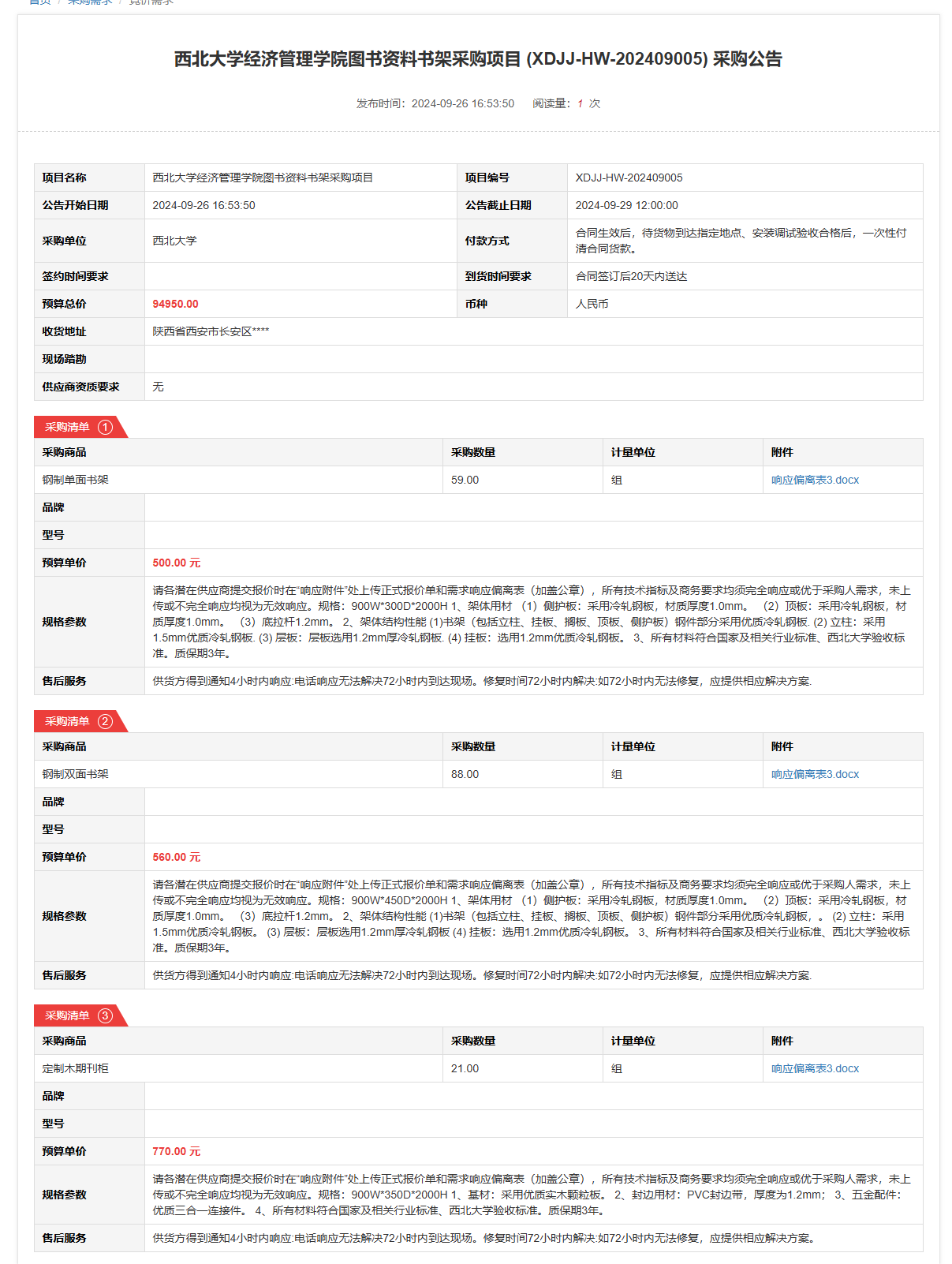 西北大学经济管理学院图书资料书架采购项目(XDJJ-HW-202409005)竞价采购公告