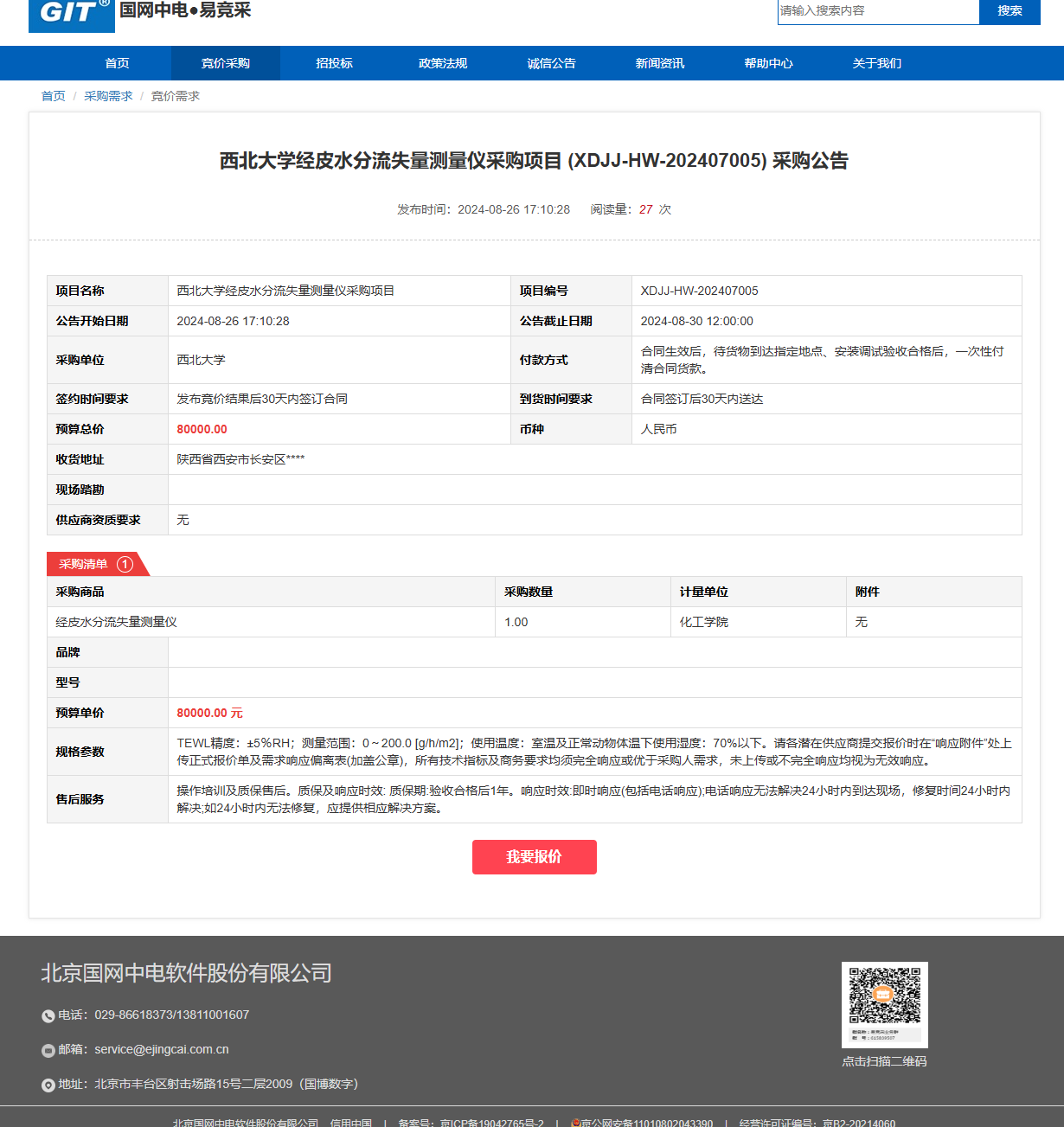 西北大学经皮水分流失量测量仪采购项目 (XDJJ-HW-202407005) 竞价采购公告