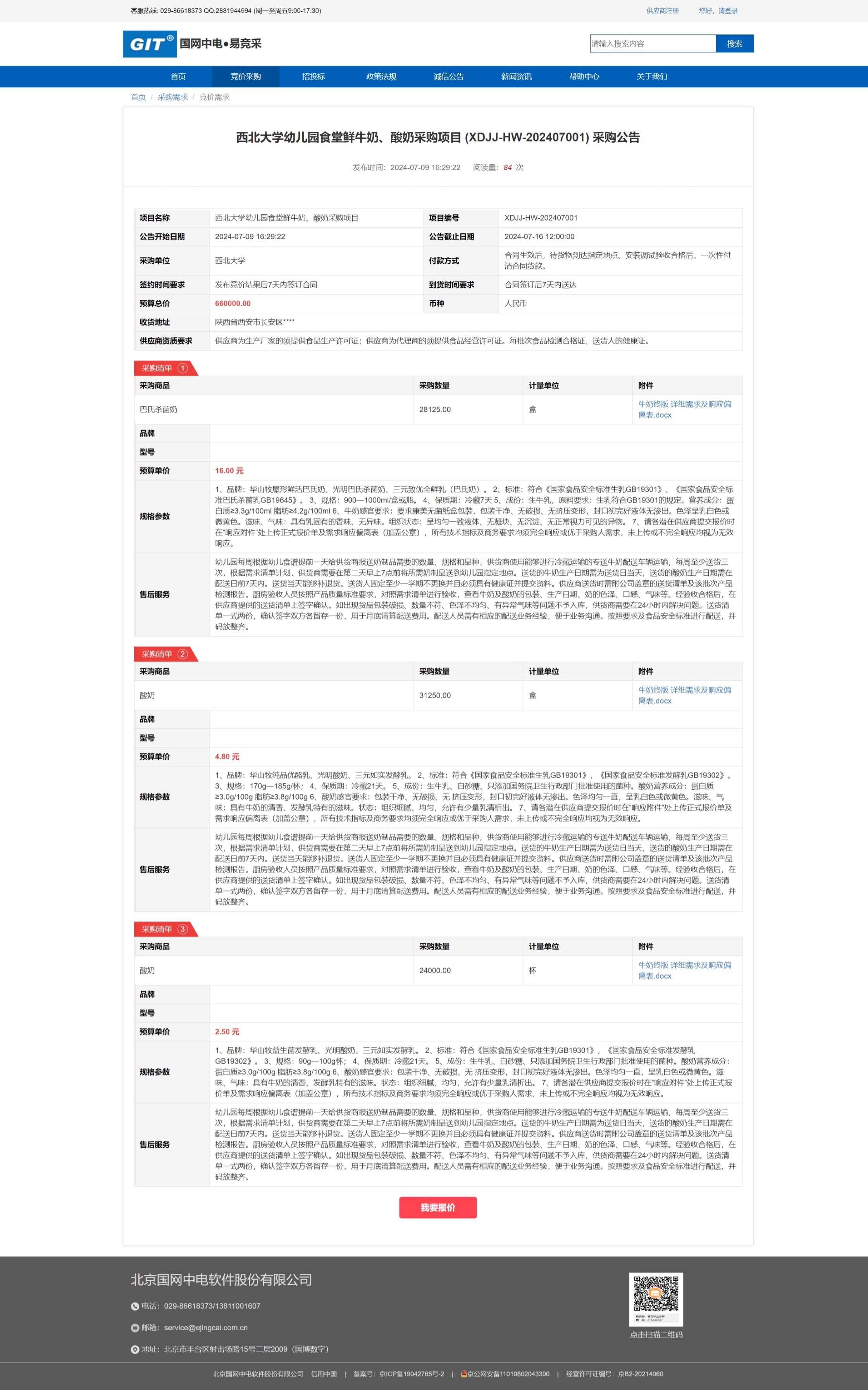 西北大学幼儿园食堂鲜牛奶、酸奶采购项目 (XDJJ-HW-202407001) 竞价采购公告