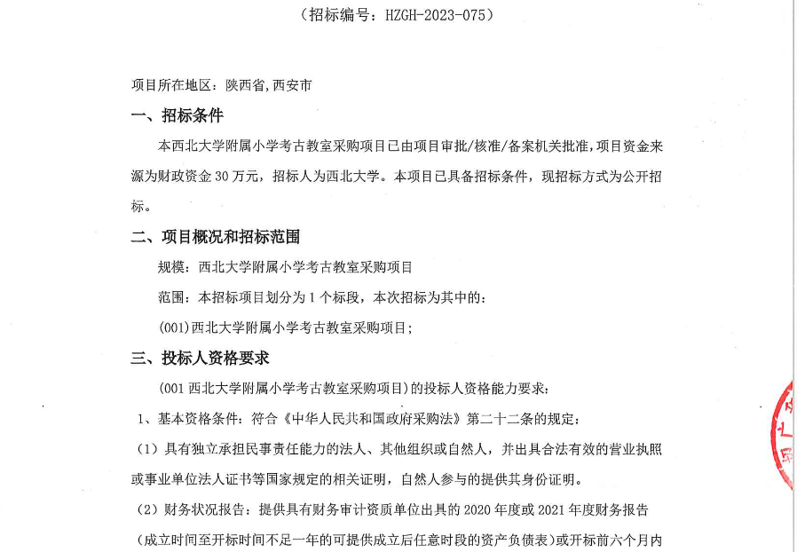 西北大学附属小学考古教室采购项目招标公告
