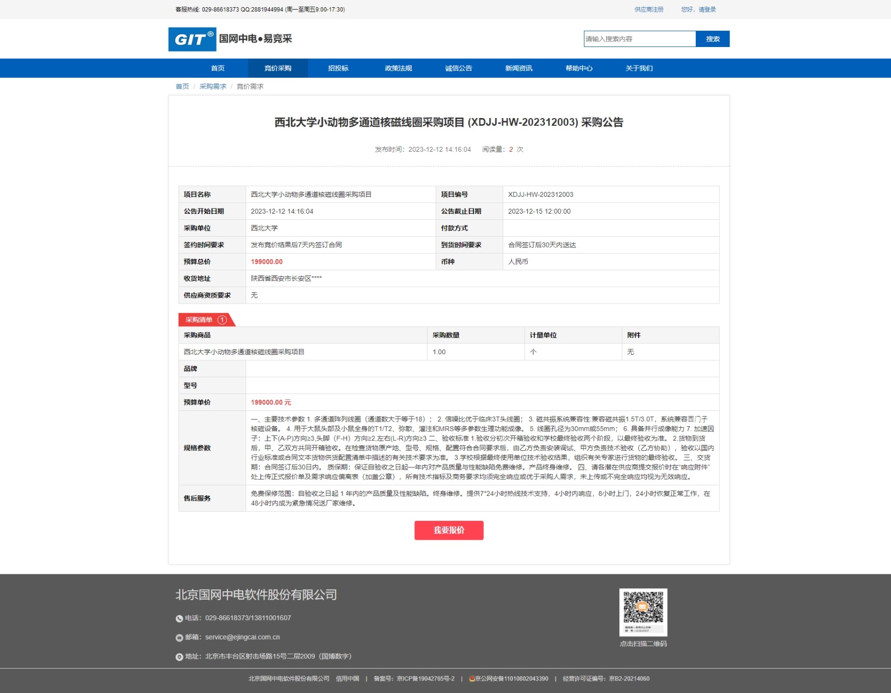 西北大学小动物多通道核磁线圈采购项目 (XDJJ-HW-202312003) 采购公告