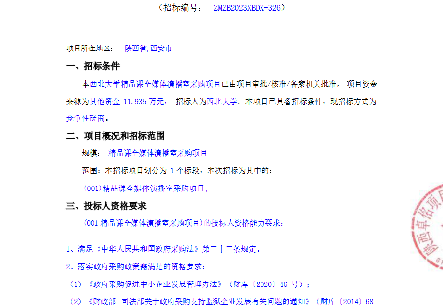 西北大学精品课全媒体演播室采购项目竞争性磋商公告