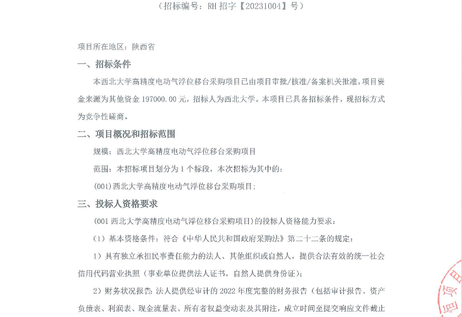 西北大学高精度电动气浮位移台采购项目竞争性磋商公告