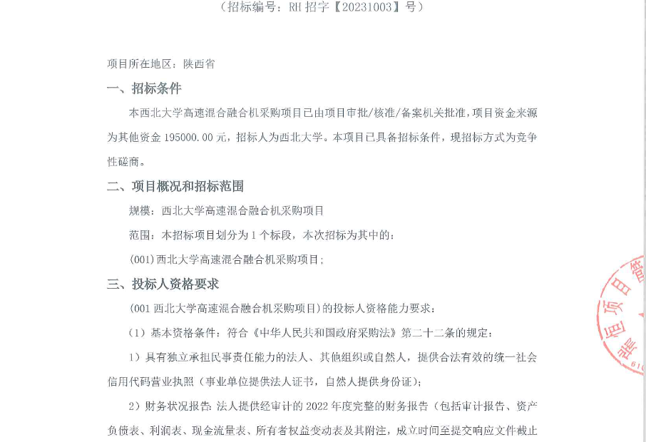 西北大学高速混合融合机采购项目竞争性磋商公告