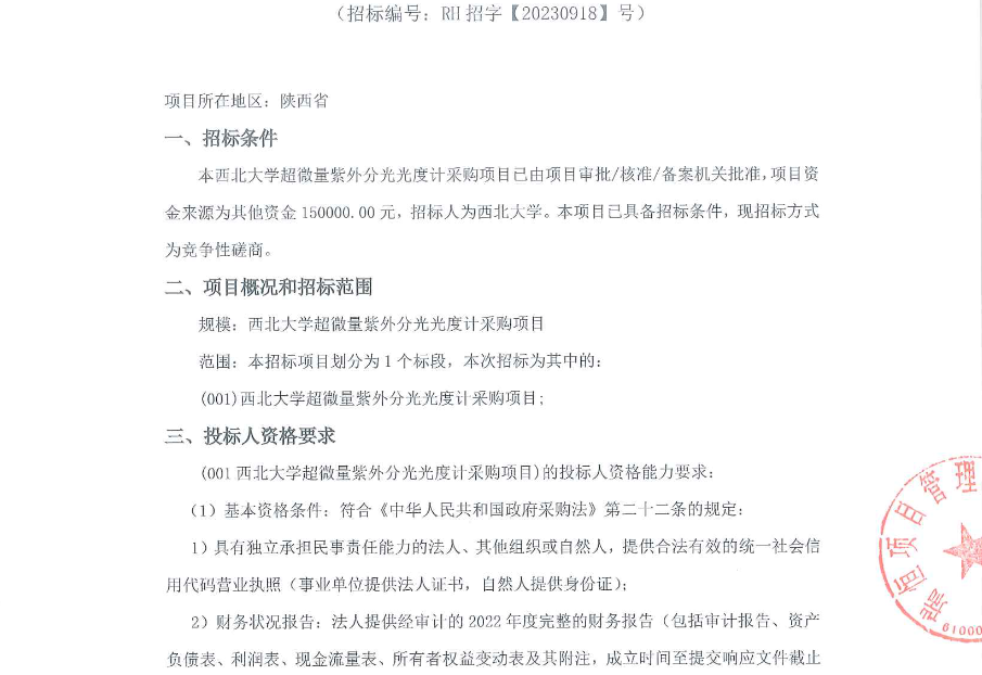 西北大学超微量紫外分光光度计采购项目竞争性磋商公告
