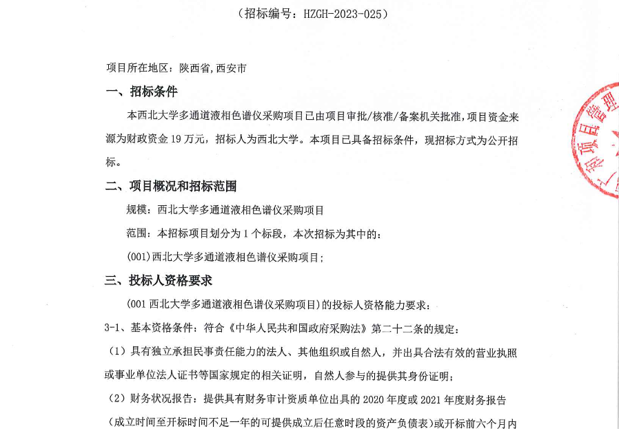 西北大学多通道液相色谱仪采购项目公开招标公告