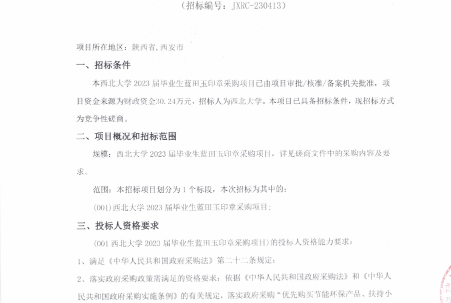 西北大学2023届毕业生蓝田玉印章采购项目竞争性磋商公告