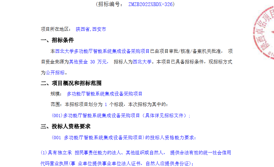 西北大学多功能厅智能系统集成设备采购项目公开招标公告