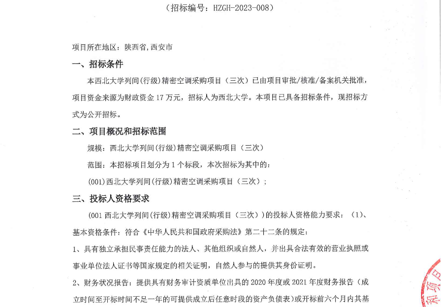 西北大学列间(行级)精密空调采购项目(三次)招标公告