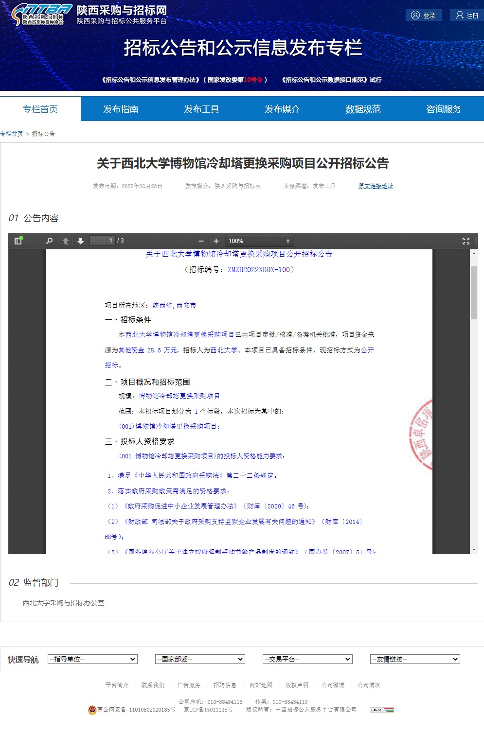 关于西北大学博物馆冷却塔更换采购项目公开招标公告