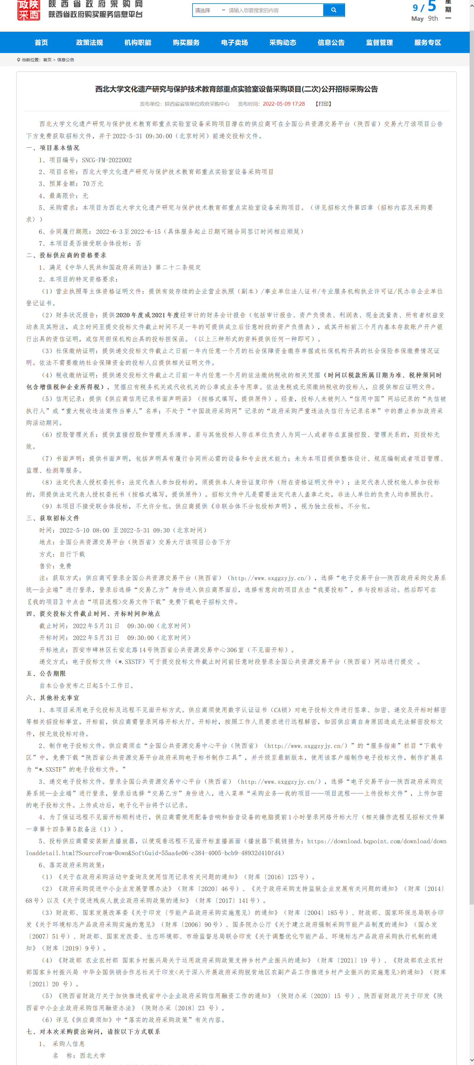 西北大学文化遗产研究与保护技术教育部重点实验室设备采购项目(二次)公开招标采购公告
