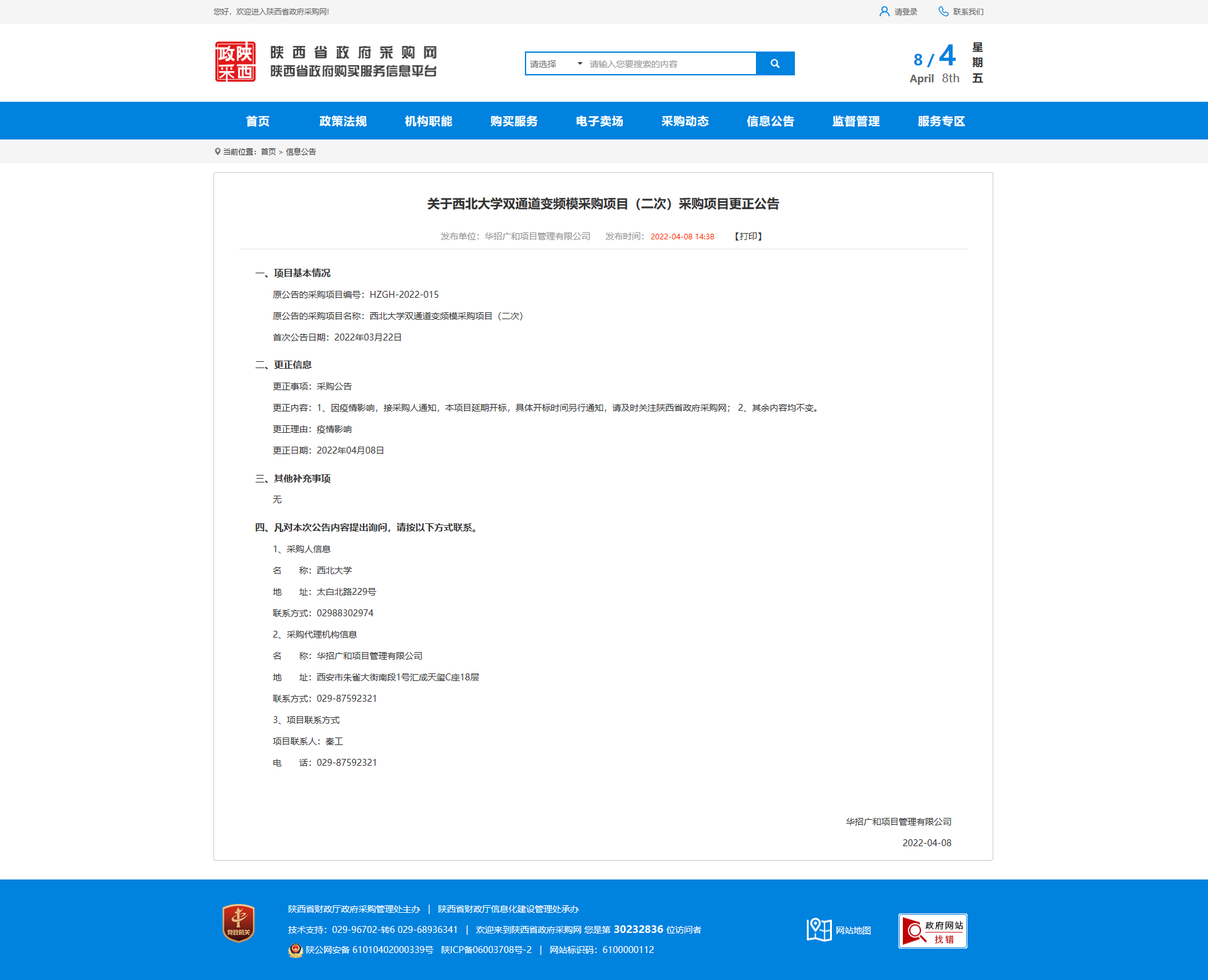 关于西北大学双通道变频模采购项目(二次)采购项目更正公告