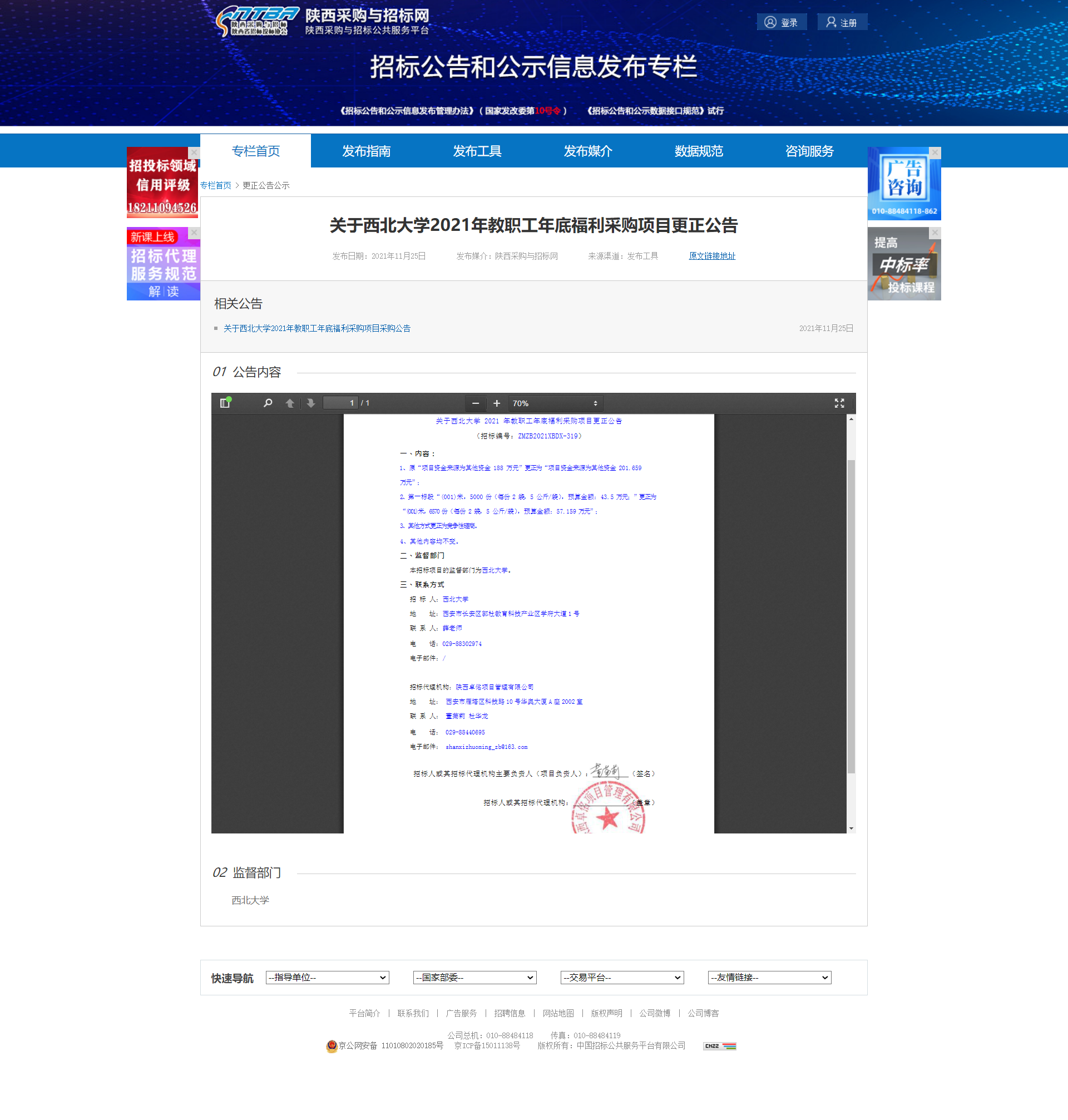 关于西北大学2021年教职工年底福利采购项目更正公告
