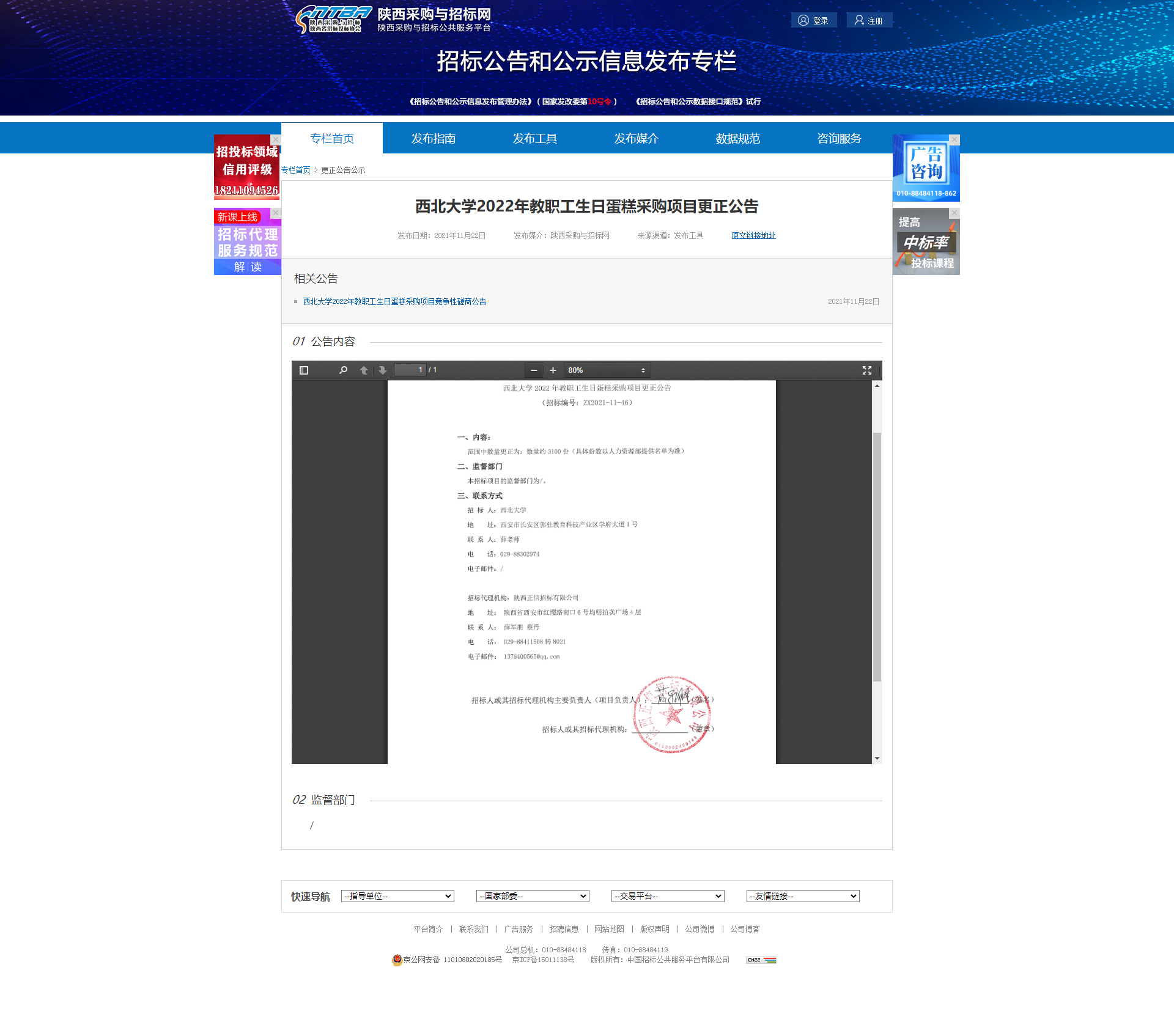 西北大学2022年教职工生日蛋糕采购项目更正公告