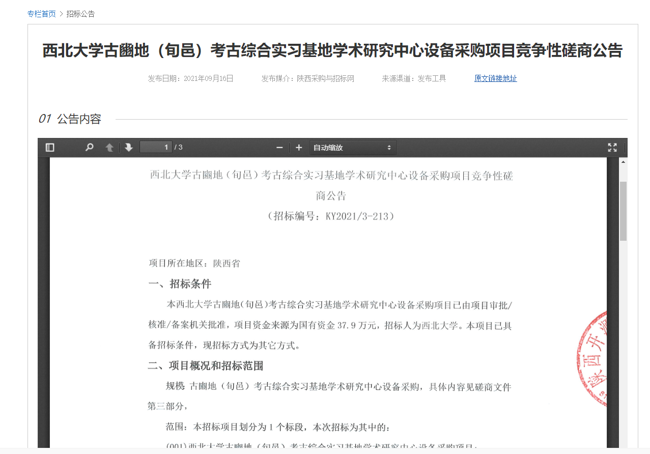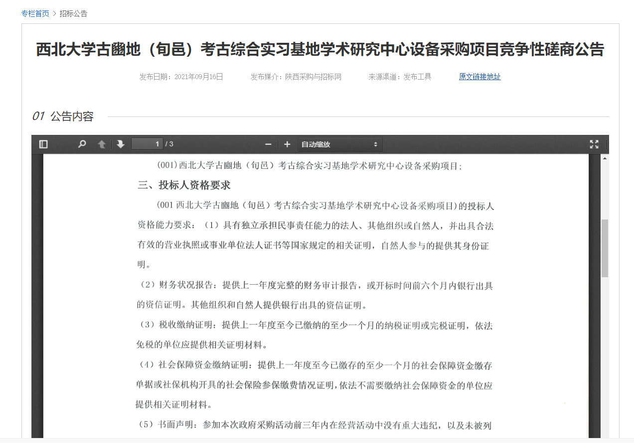 西北大学古豳地(旬邑)考古综合实习基地学术研究中心设备采购项目竞争性磋商公告