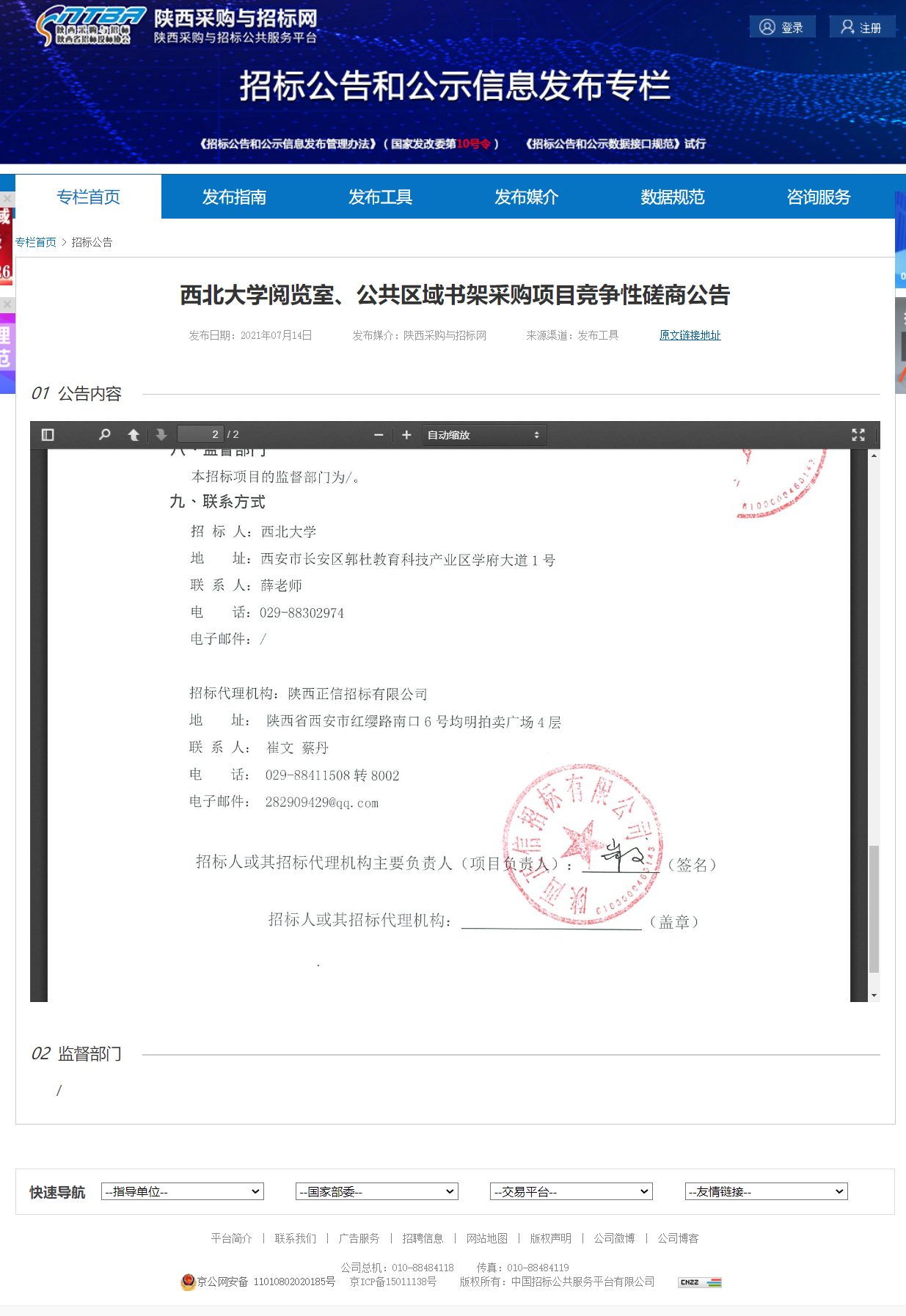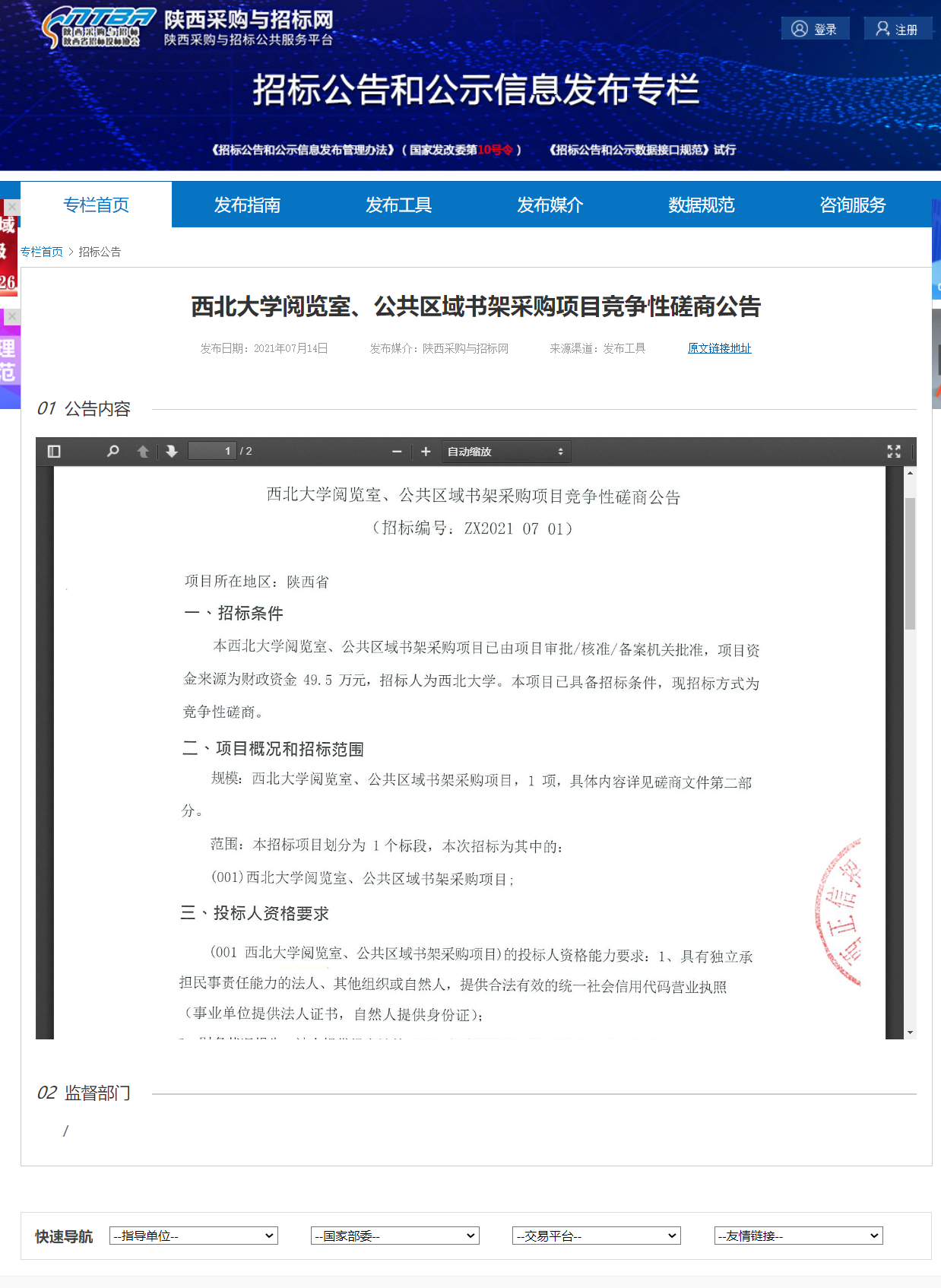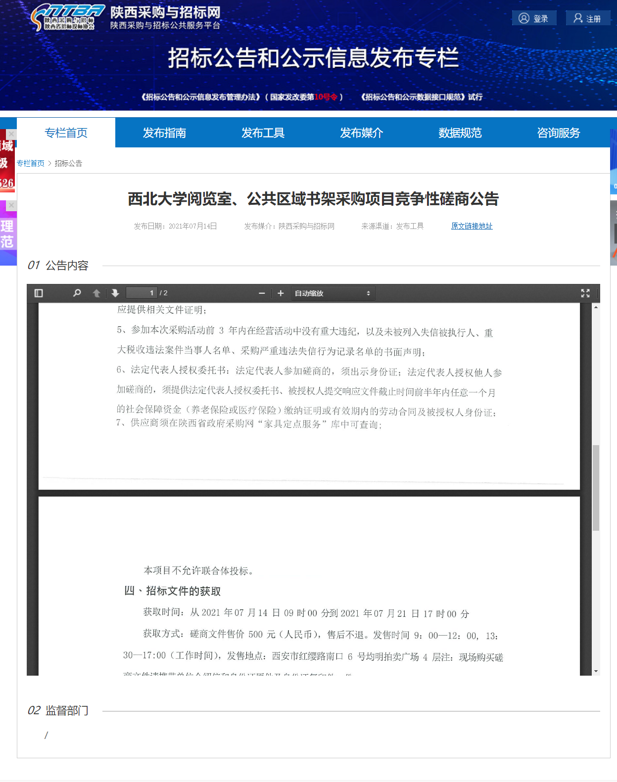 西北大学阅览室、公共区域书架采购项目竞争性磋商公告