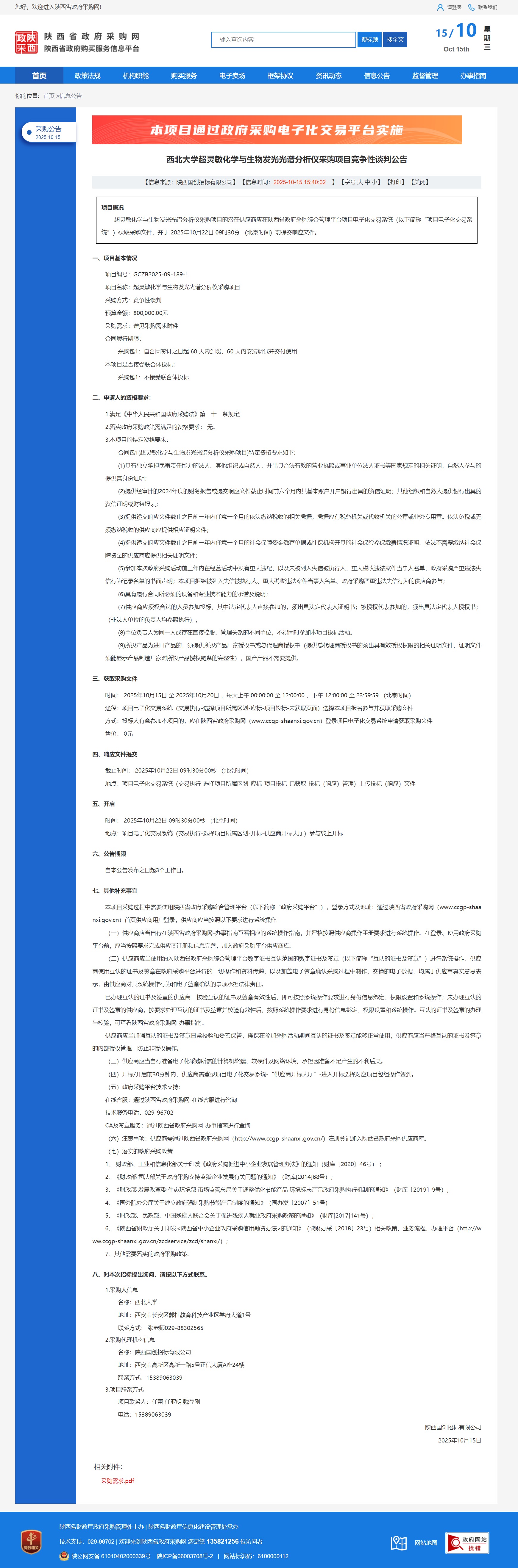 西北大学超灵敏化学与生物发光光谱分析仪采购项目竞争性谈判公告
