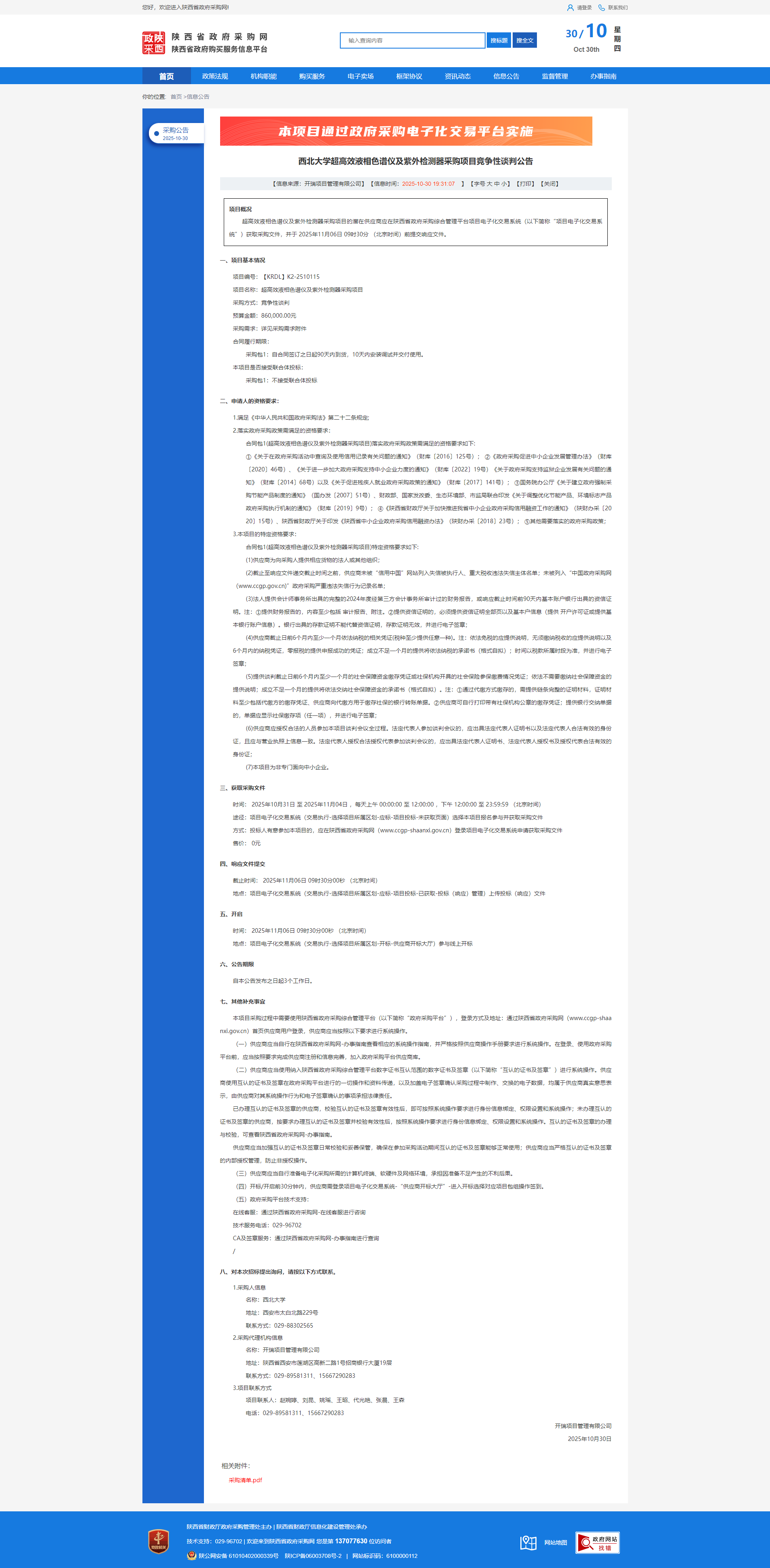 西北大学超高效液相色谱仪及紫外检测器采购项目竞争性谈判公告