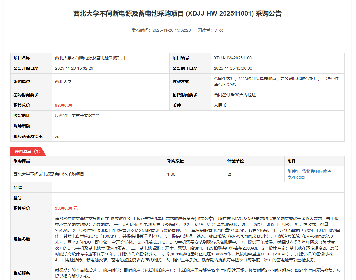 西北大学不间断电源及蓄电池采购项目(XDJJ-HW-202511001)竞价采购公告