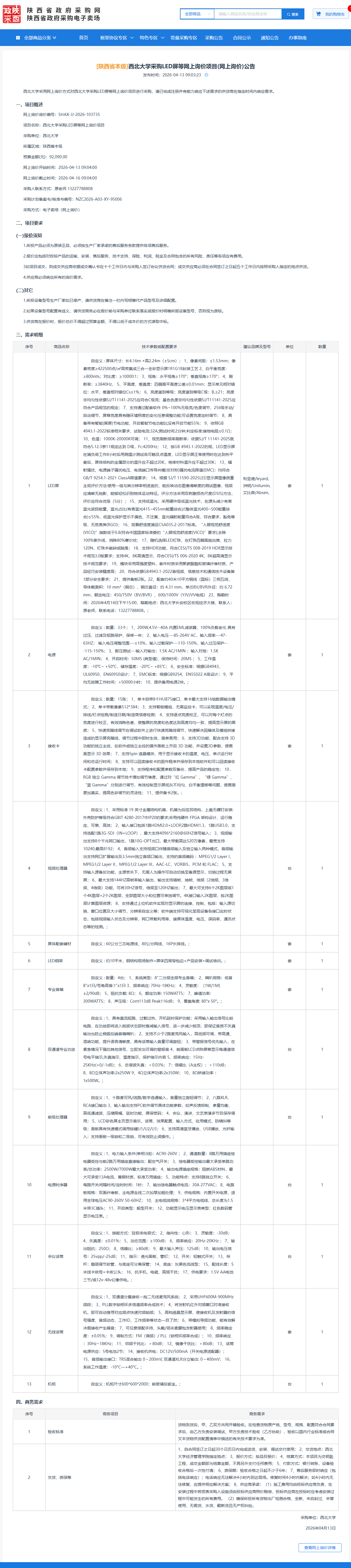 西北大学采购LED屏等网上询价项目(网上询价)公告