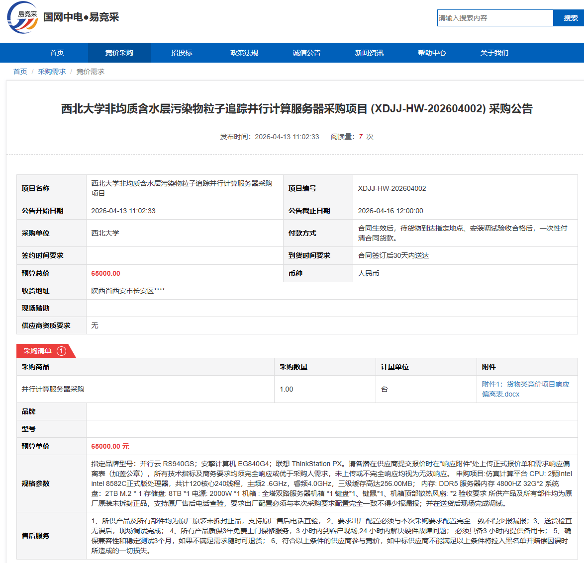 西北大学非均质含水层污染物粒子追踪并行计算服务器采购项目(XDJJ-HW-202604002)竞价采购公告