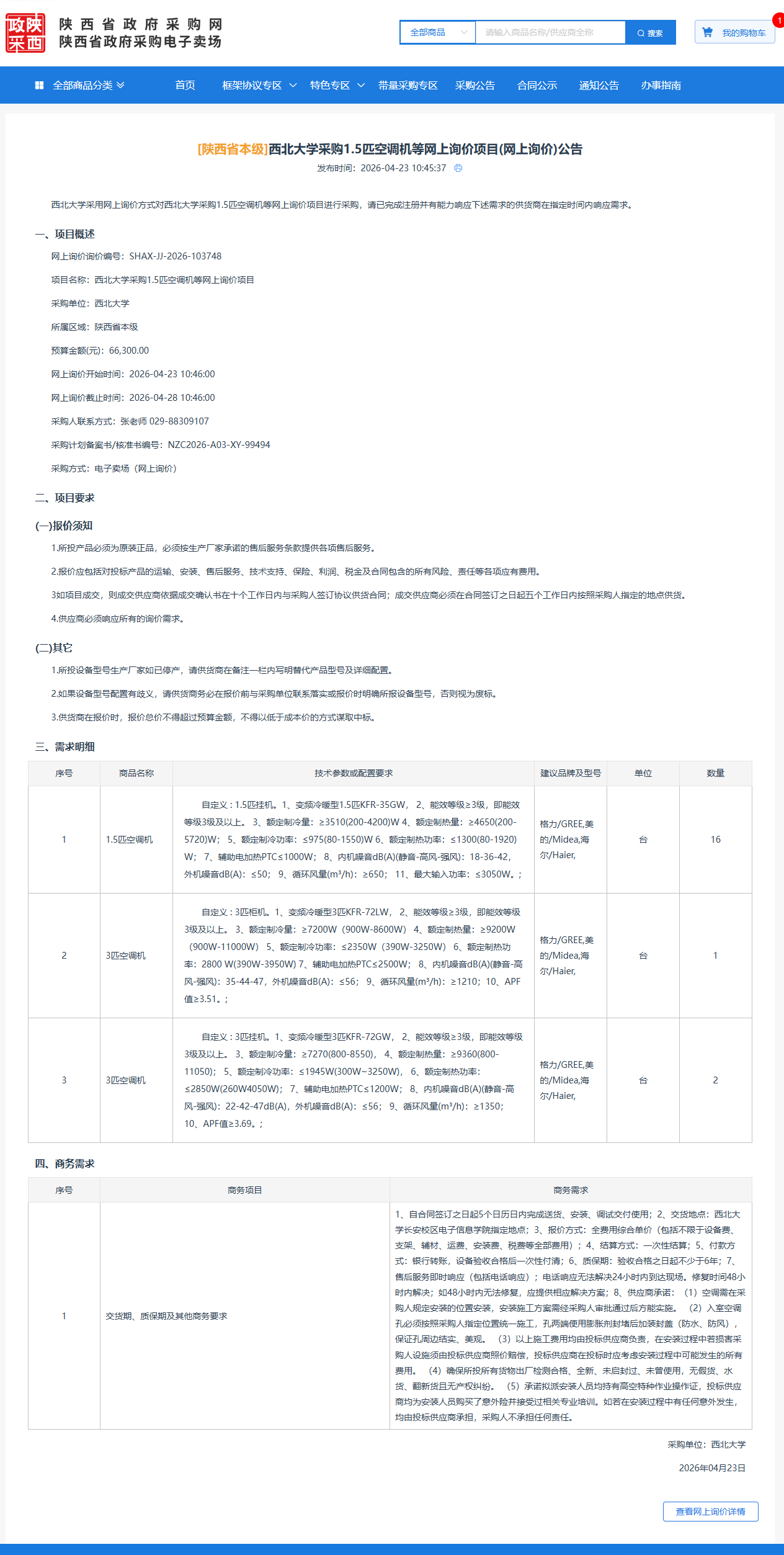 西北大学采购1.5匹空调机等网上询价项目(网上询价)公告