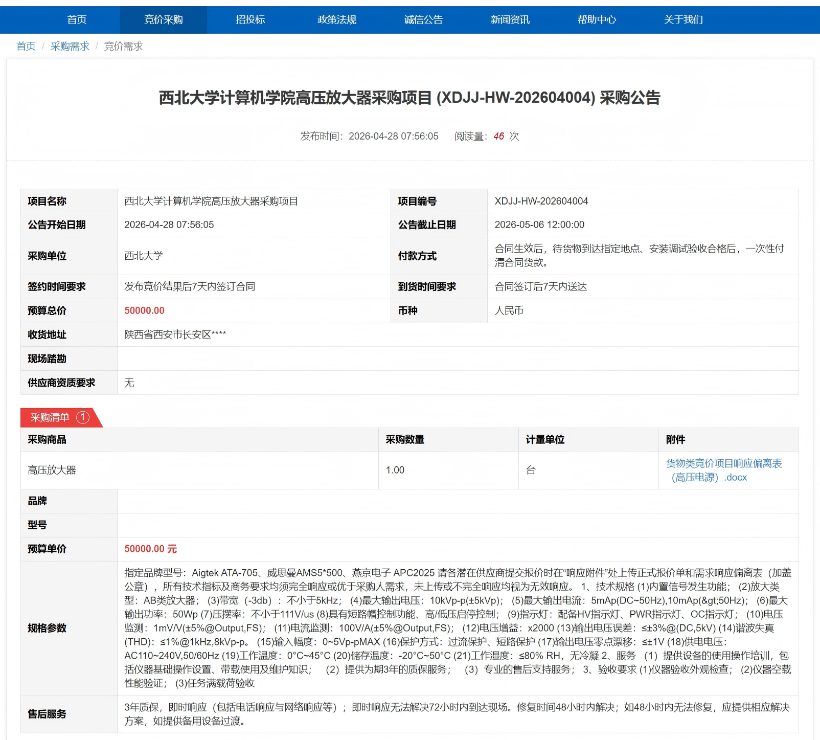 西北大学计算机学院高压放大器采购项目(XDJJ-HW-202604004)竞价采购公告