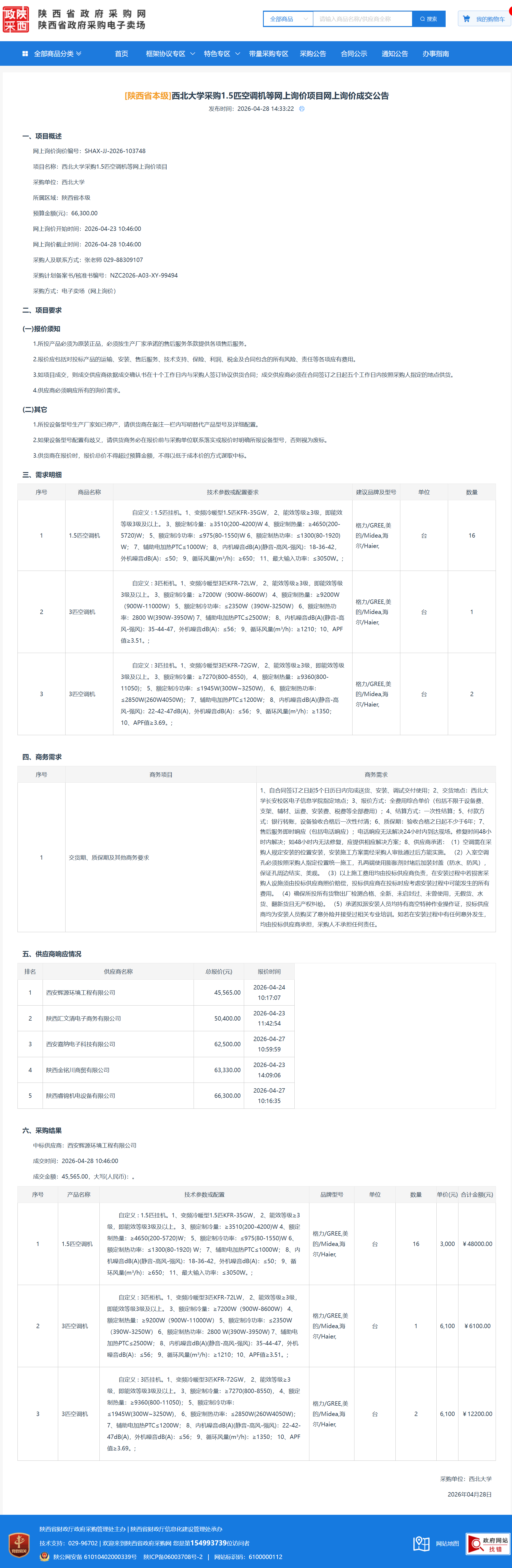 西北大学采购1.5匹空调机等网上询价项目网上询价成交公告