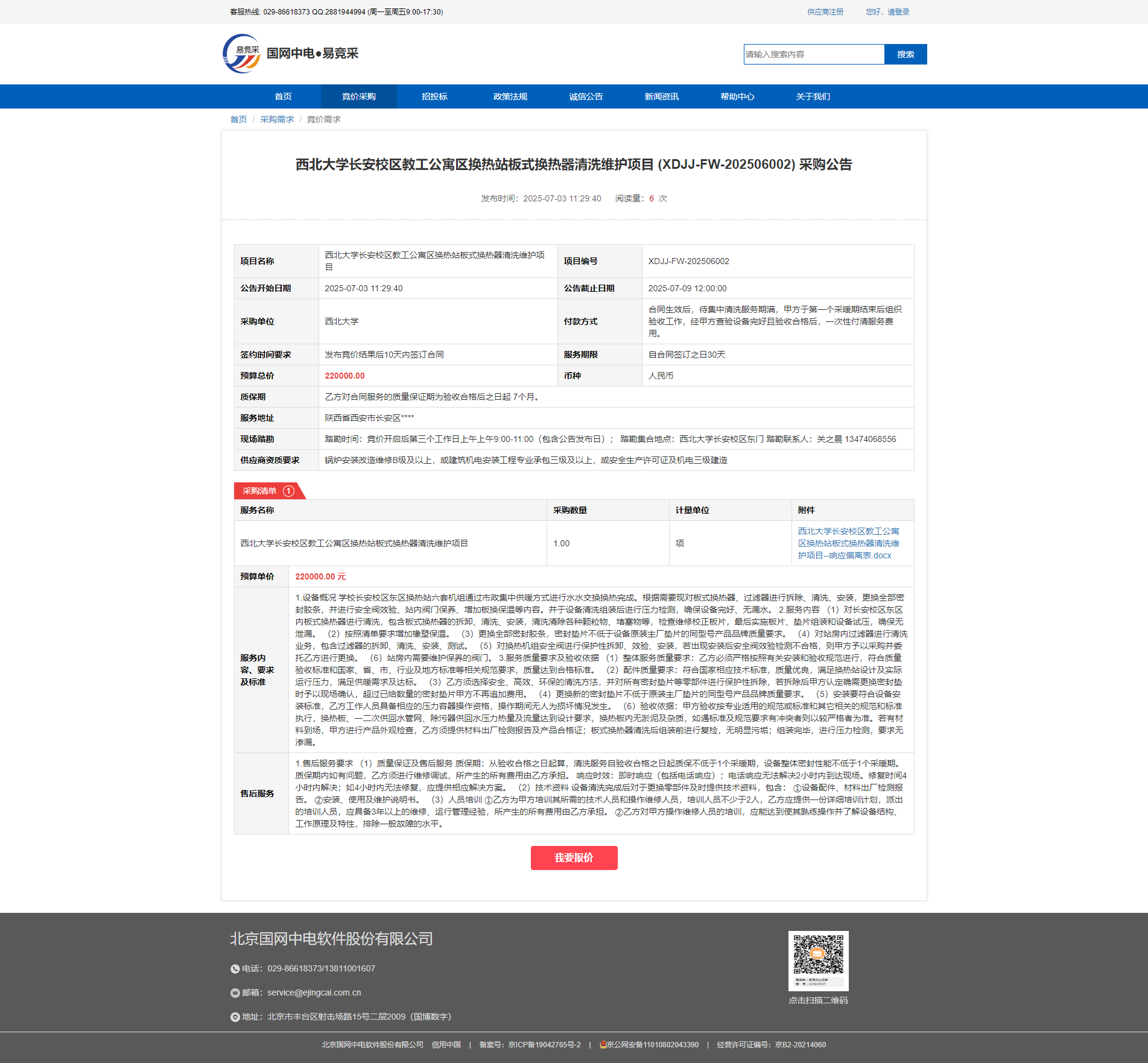 西北大学长安校区教工公寓区换热站板式换热器清洗维护项目 (XDJJ-FW-202506002) 采购公告