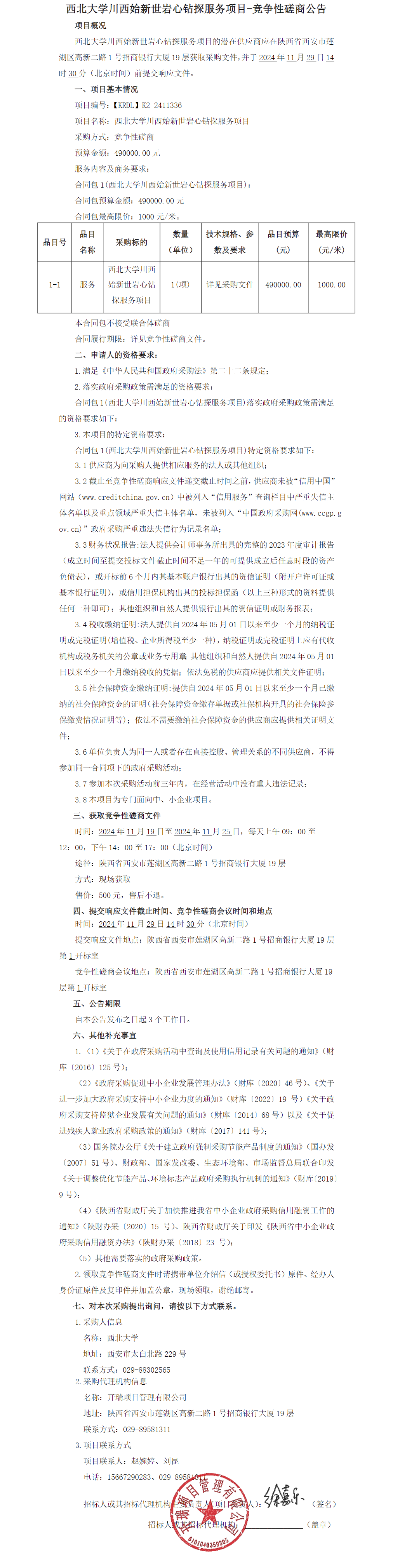 西北大学川西始新世岩心钻探服务项目竞争性磋商公告