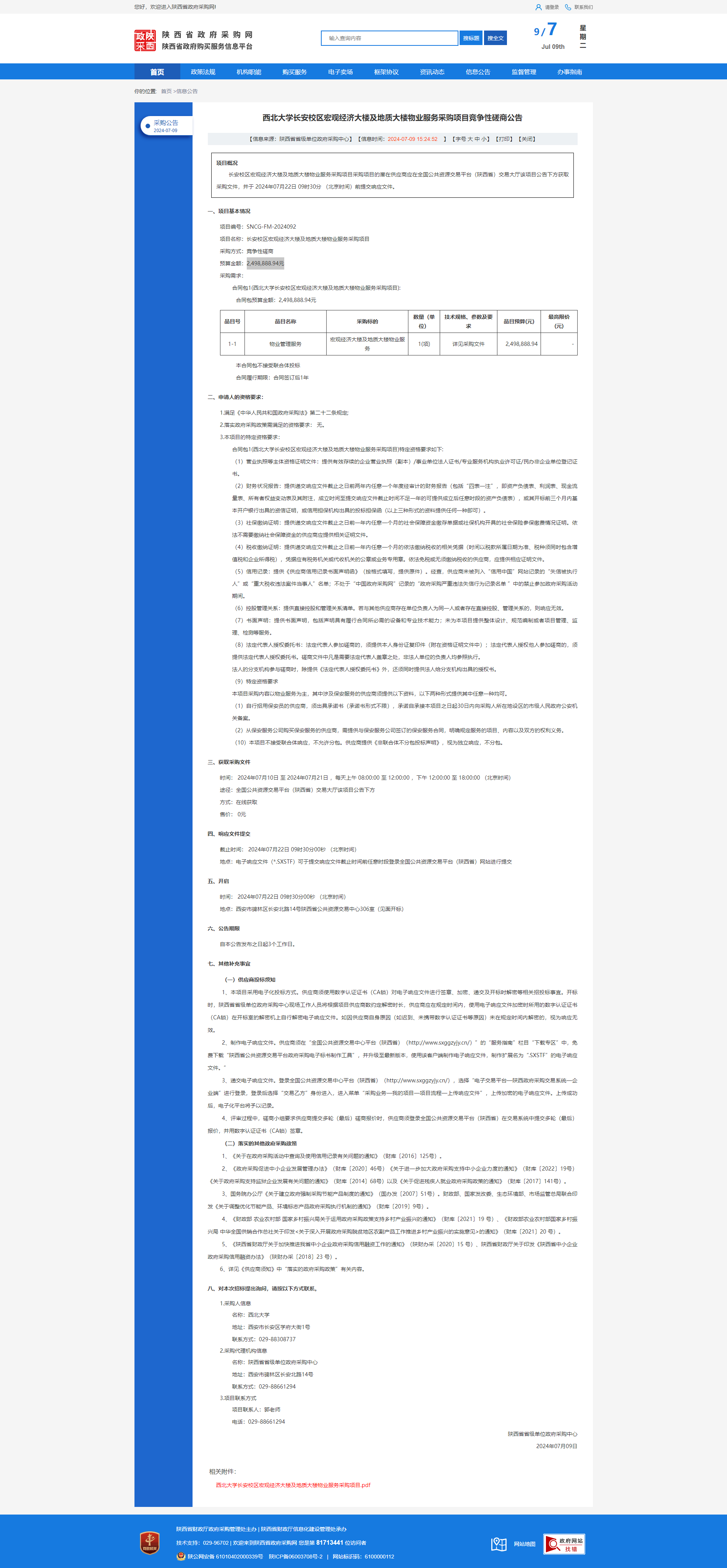 西北大学长安校区宏观经济大楼及地质大楼物业服务采购项目竞争性磋商公告