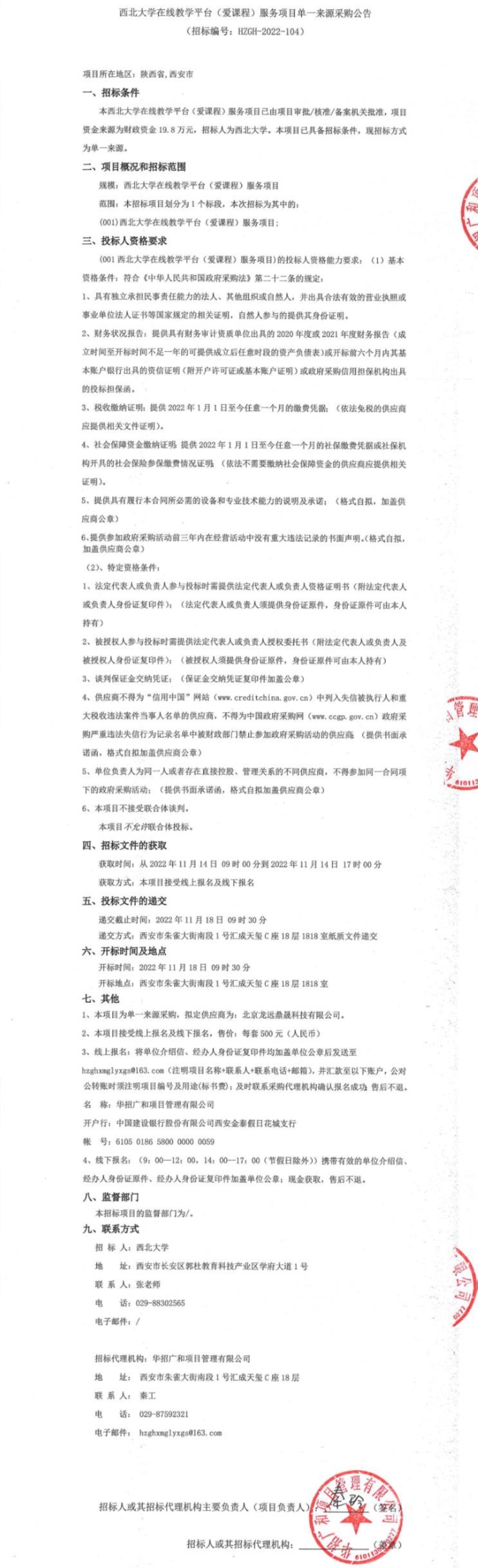 西北大学在线教学平台(爱课程)服务项目单一来源采购公告