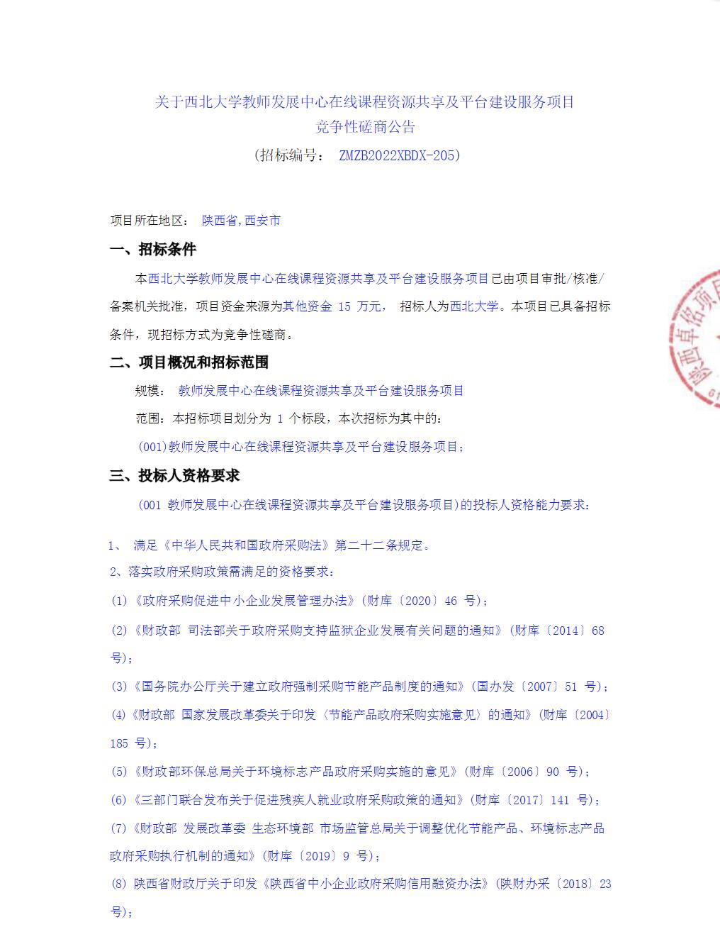 西北大学教师发展中心在线课程资源共享及平台建设服务项目竞争性磋商公告