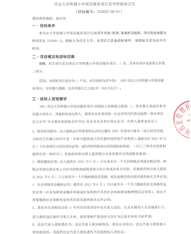 西北大学附属小学保洁服务项目竞争性磋商公告