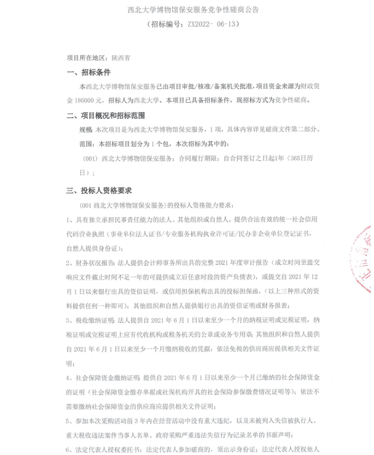 西北大学博物馆保安服务竞争性磋商公告