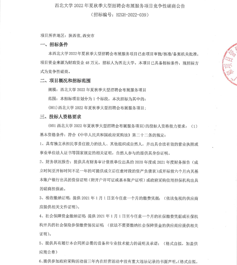 西北大学2022年夏秋季大型招聘会布展服务项目竞争性磋商公告