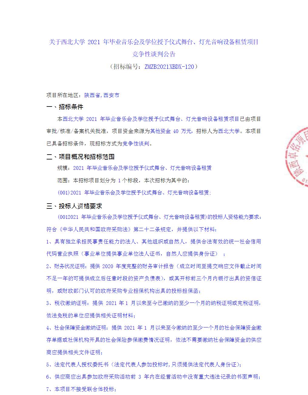 西北大学2021年毕业音乐会及学位授予仪式舞台、灯光音响设备租赁项目竞争性谈判公告
