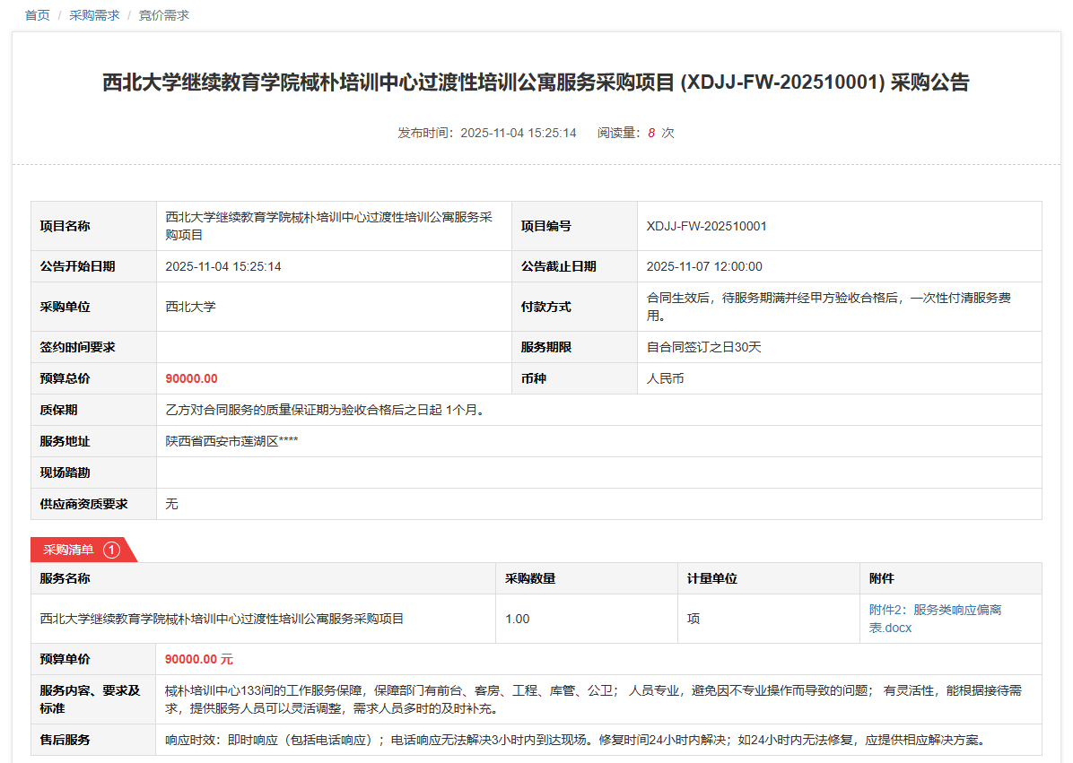 西北大学继续教育学院棫朴培训中心过渡性培训公寓服务采购项目(XDJJ-FW-202510001)竞价采购公告