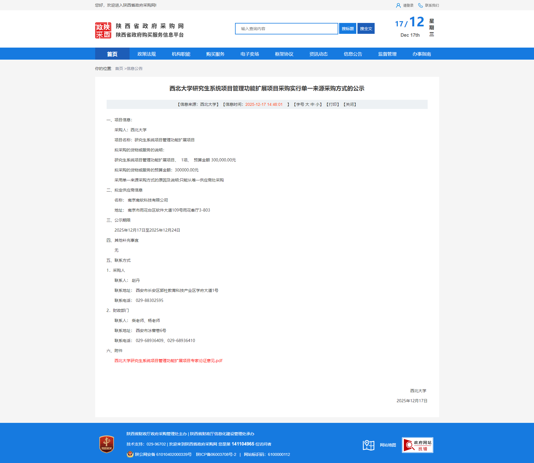 西北大学研究生系统项目管理功能扩展项目采购实行单一来源采购方式的公示